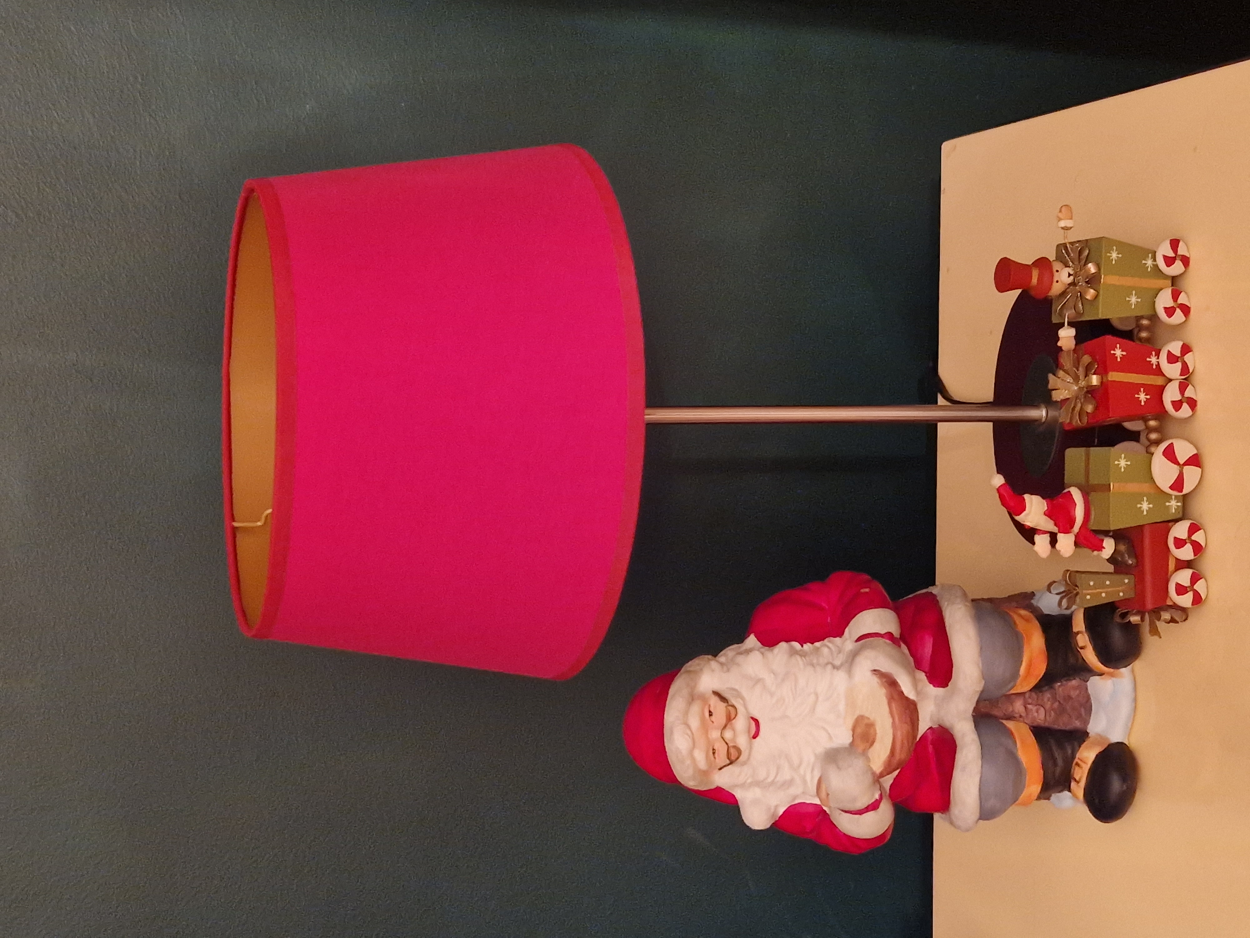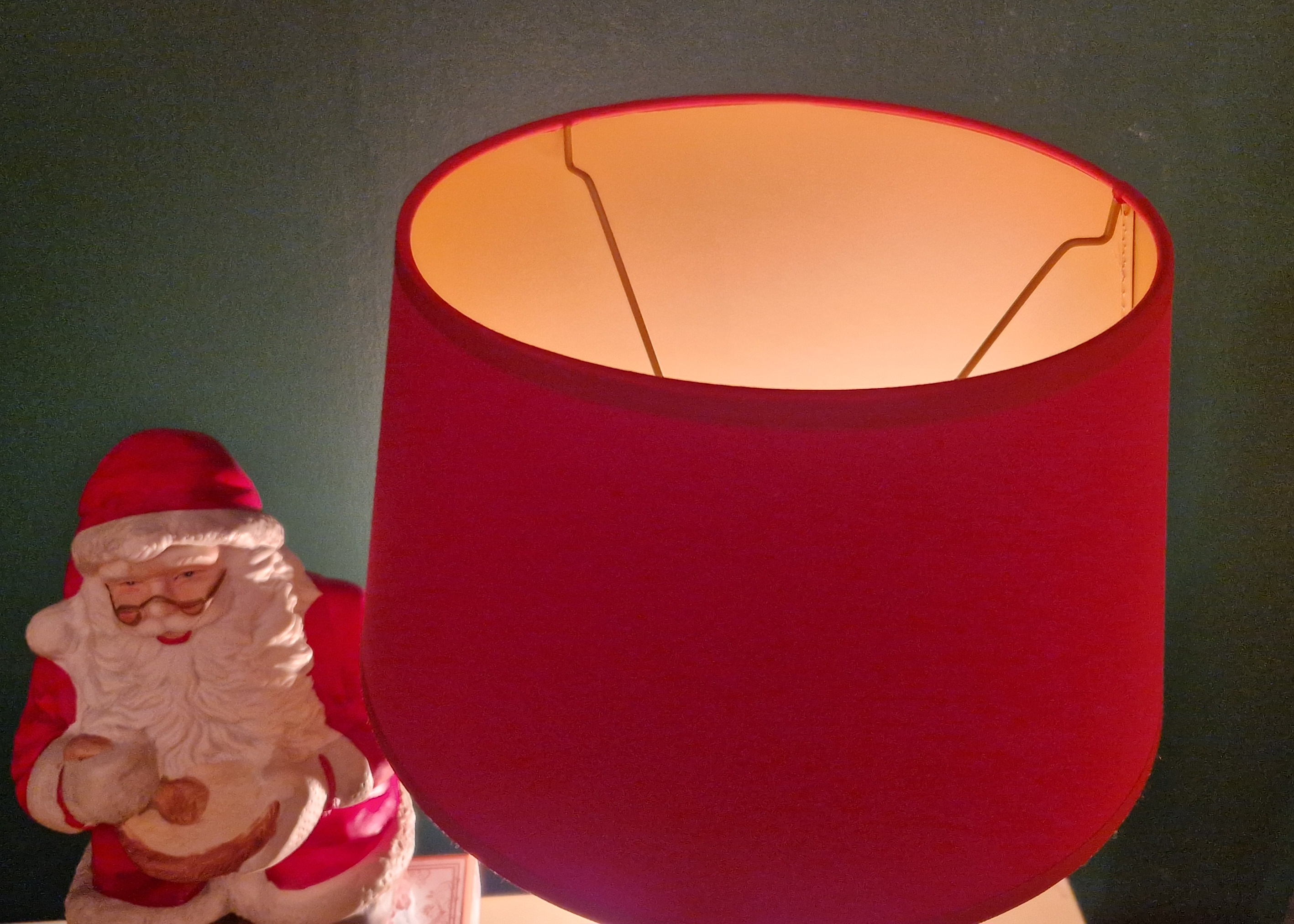 Bordowy chintz na złotym spodzie. Pięknie podświetla lampę, daje ciepłe światło. Pięknie eksponuje lampę.